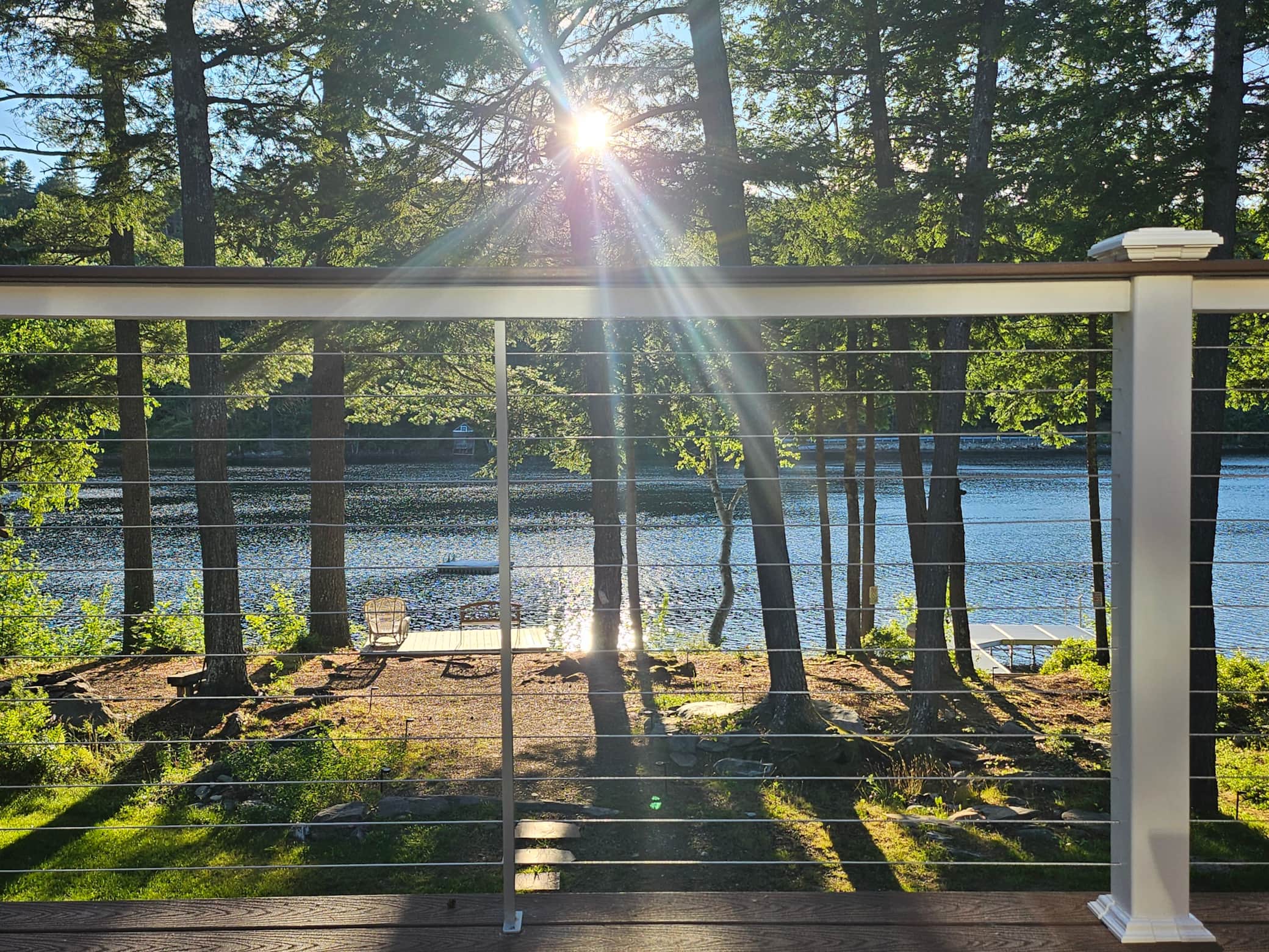 With 4 bedrooms (2 upstairs [king & double] and 2 at ground level [two twins & queen]) and 2.5 baths, there is plenty of room for up to 8 people. The ground level also offers beautiful views of the lake from its 4 large windows and sliding glass door. The 2-story configuration provides a layer of privacy for that second family, or the kids, to wind down and enjoy board games, the snack nook, and the second living area after a day in the sun, before an evening of s'mores around the campfire. The house is well stocked with linens, utensils, a grill, cooking appliances, cookware, a washer and dryer, and 3 large screen TVs to create a stress-free vacation. Our lakeside home has central air conditioning (Central AC) and is located down a quiet private dirt/gravel road that is a quick ride to town for lunch, an ice cream, supplies and other larger lakes, such as Long Pond, Great Pond and more!